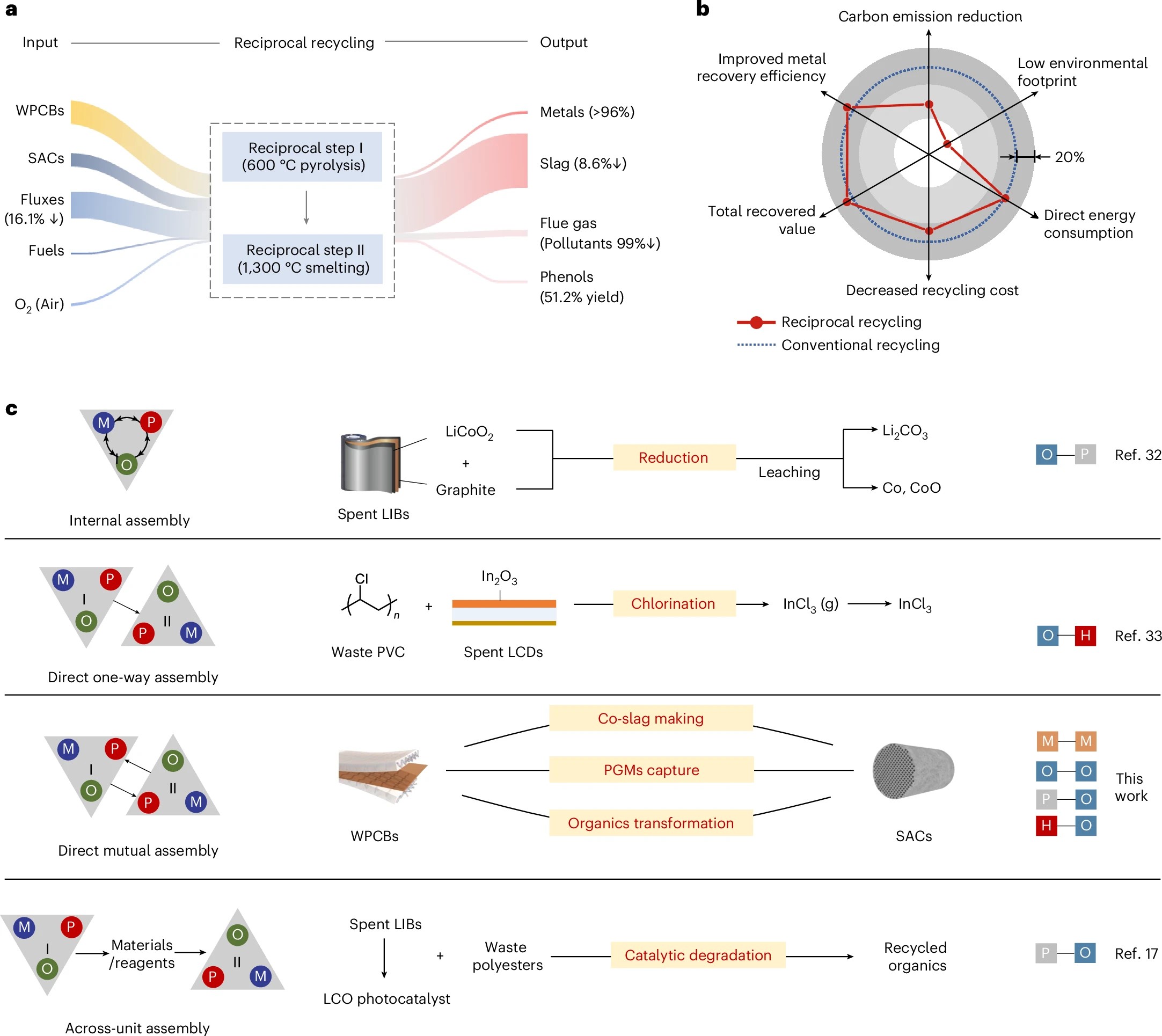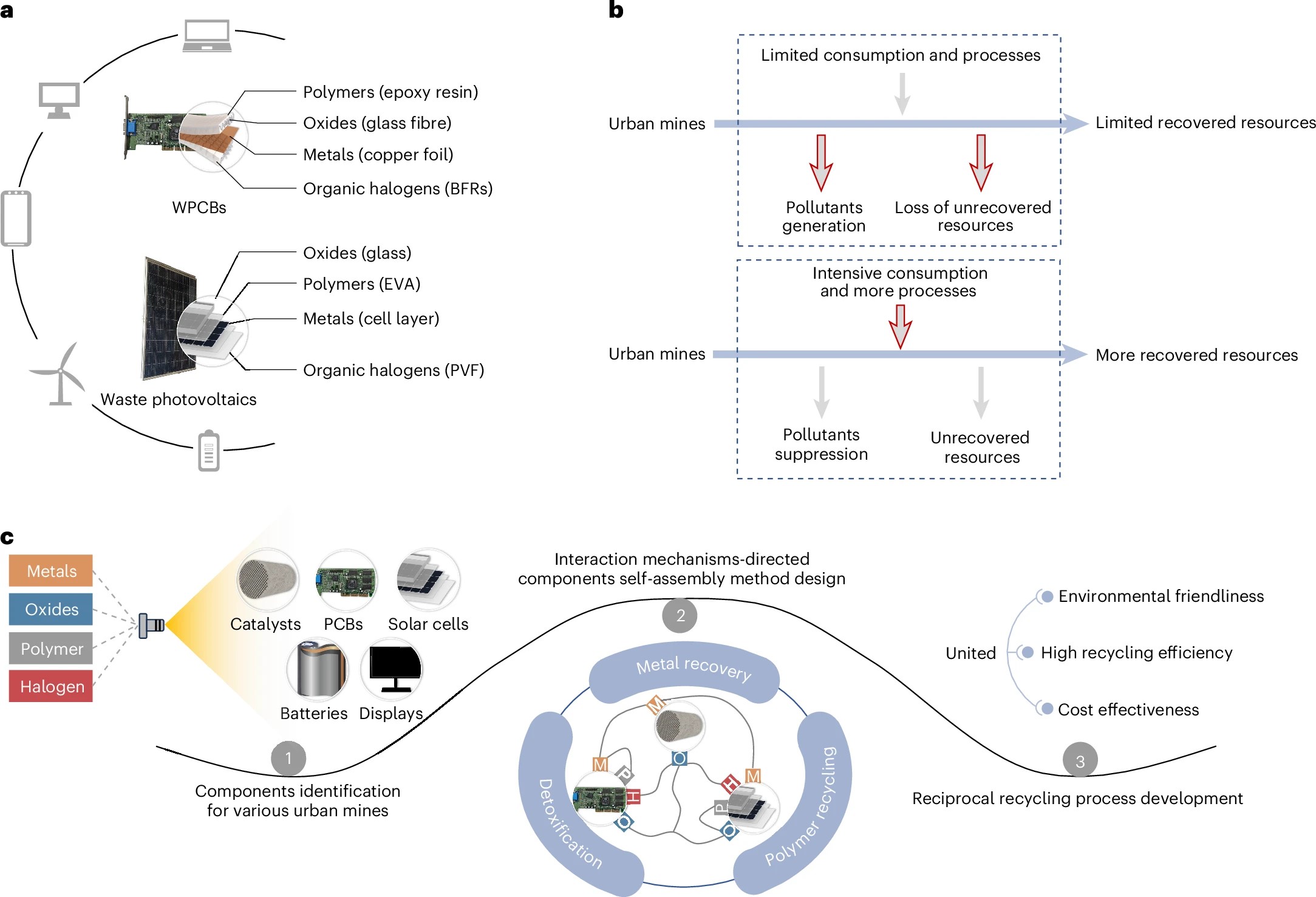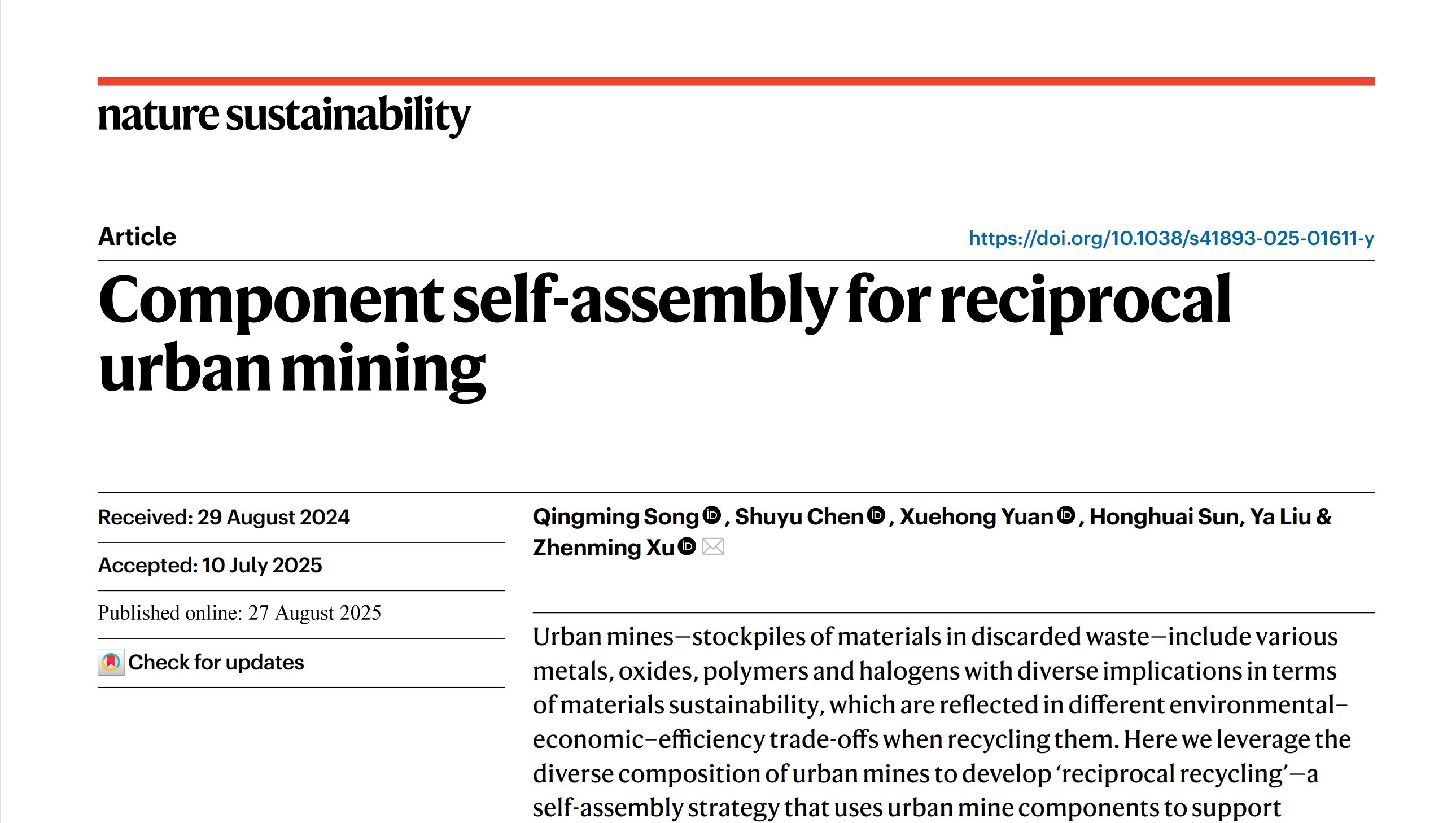 近日,威廉希尔体育网许振明教授团队在《Nature Sustainability》在线发表了题为“Component self-assembly for reciprocal urban mining”的研究成果。该研究提出了一种城市矿产组分自组装互惠回收策略,利用其组分多样性特征实现城市矿产的可持续互惠互助回收。威廉希尔体育网博士后宋庆明为论文第一作者,许振明教授为论文唯一通讯作者。本工作受到国家自然科学基金资助。