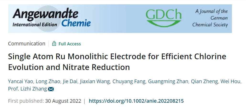 近日,威廉希尔体育网张礼知教授团队在Angew. Chem.在线发表了研究论文Single Atom Ru Monolithic Electrode for Efficient Chlorine Evolution and Nitrate Reduction,威廉希尔体育网长聘教轨助理教授么艳彩为该论文第一作者,特聘教授张礼知为通讯作者。