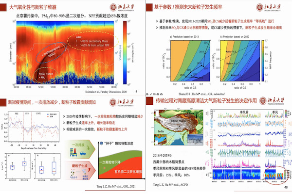 新粒子生成在全球不同环境大气中普遍发生,是大气超细颗粒物的重要来源。在我国新粒子生成和后续增长是PM2.5和霾污染的重要机制之一。胡敏教授结合自己团队近年来的研究成果,分别从“长期观测的新粒子生成演变趋势”、“冬季新粒子生成对颗粒物数浓度的贡献”、“COVID-19下颗粒物数谱特征的变化”和“传输过程对新粒子生成的影响”等四个方面展开分享,并对未来大气新粒子生成与增长机制的研究进行了展望。